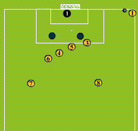 Pase de X1 a X2 quien tras controlar y realizar una pequeña conducción abre a X3.X3 realizará un cambio de orientación buscando la llegada de X7 al segundo palo.X7 aprovechará el espacio libre dejado por sus 3 compañeros.